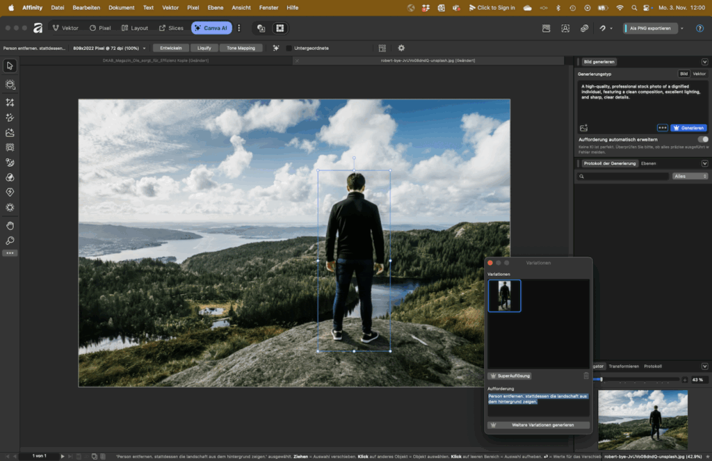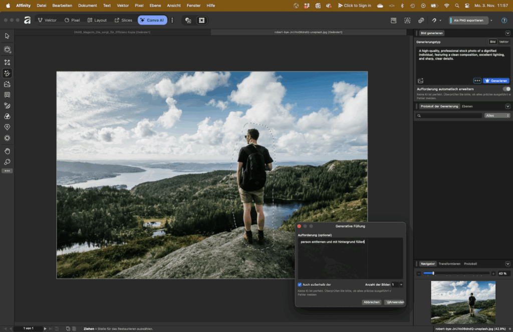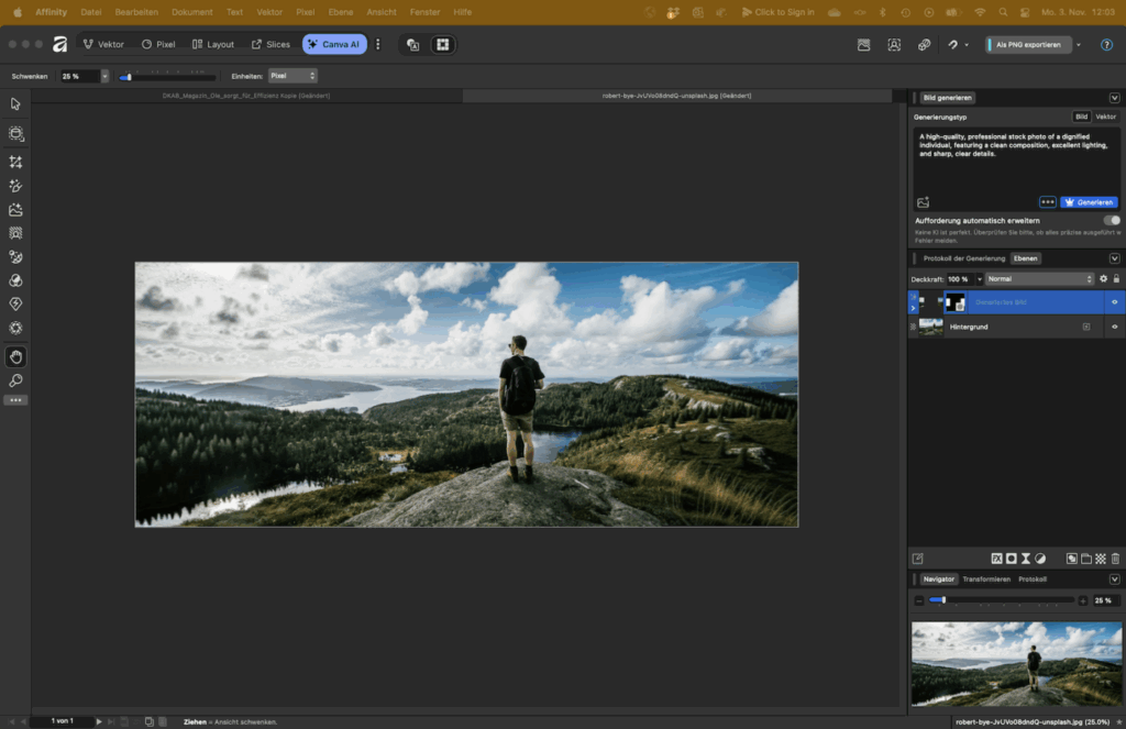Sehr zu schätzen gelernt habe ich in Photoshop zuletzt das generative Erweitern und das KI-gestützte Entfernen von Objekten. Diese Funktionen sind auch in Affinity verfügbar. Allerdings erfordern die KI-Funktionen ein kostenpflichtiges Canva Pro-Abo. Die 10 €/Monat sind aus meiner Sicht ein fairer Deal. (Den 1. Monat gibt´s zum Ausprobieren kostenlos.)