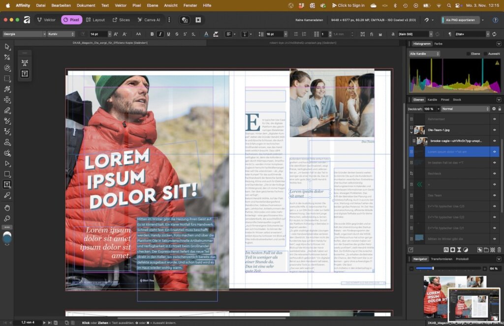 Mit der aktuellen Version sind erstmals alle drei „Welten“ in einem einzigen Programm vereint: Pixel, Layout & Vektor. Und das ist tatsächlich ein sinnvolles und cooles Feature. Ein Beispiel aus der Praxis: Du arbeitest im Layout-Modus an einem Flyer und möchtest an einem Bild noch etwas ändern. Statt das Bild in einem weiteren Programm öffnen zu müssen, kannst du es direkt in Affinity bearbeiten – genauso, wie du es aus Photoshop gewohnt bist.