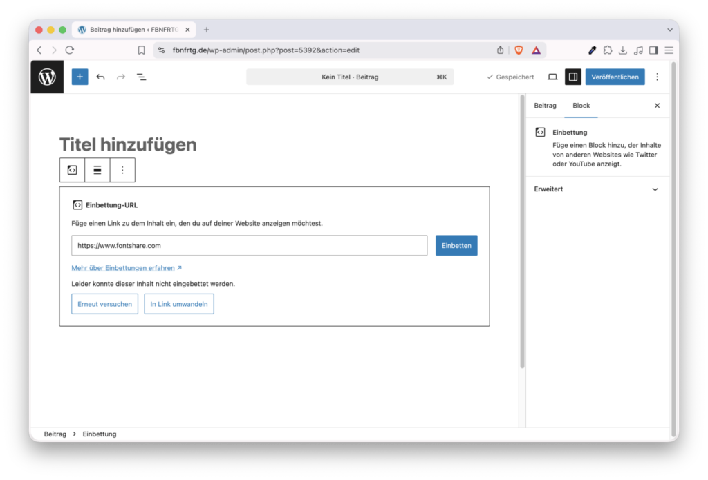 Wer häufig mit dem WordPress-Block-Editor (Gutenberg) arbeitet, kennt das Problem: Eigentlich will man nur einen Link einfügen – aber WordPress versucht automatisch eine Einbettung daraus zu machen.
